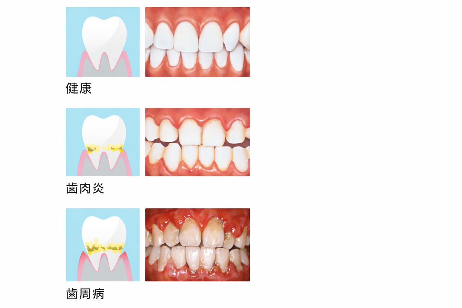 歯周病は、健康な歯ぐきの状態から歯肉炎、さらに歯周病へと段階的に進行していきます。